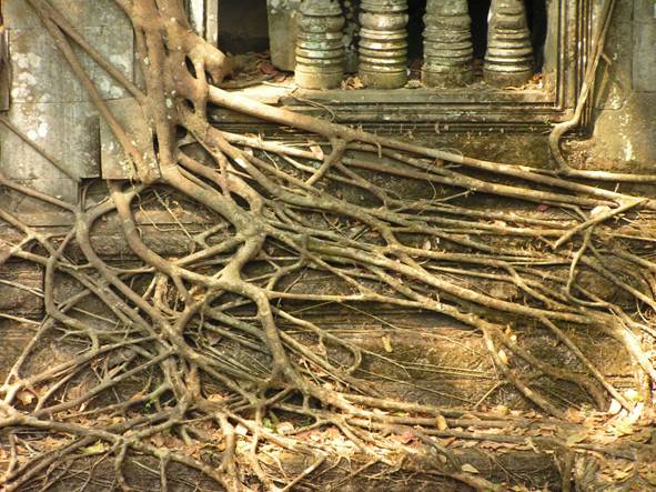 place of tumbled edifices and twisting roots. What do we see? A mocking